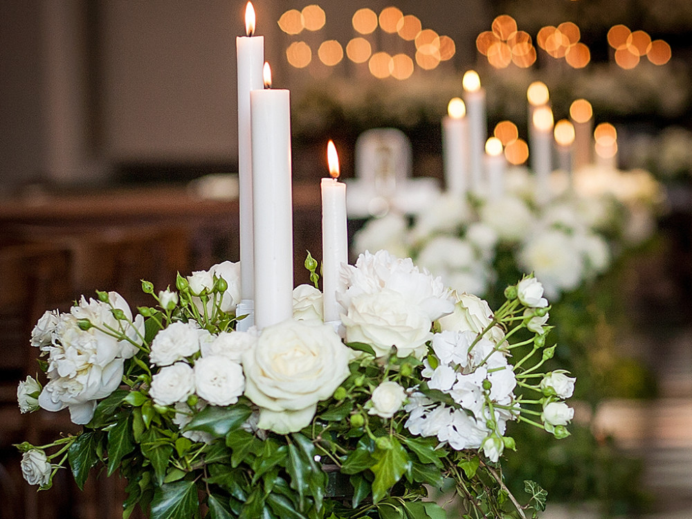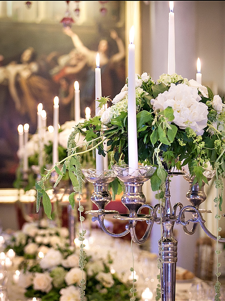 An optical white, expressed by shiny materials such as satin, porcelain, or flowers such as hydrangea, lisianthus or orchid, reflects a glamorous, modern, and somewhat minimalistic soul.