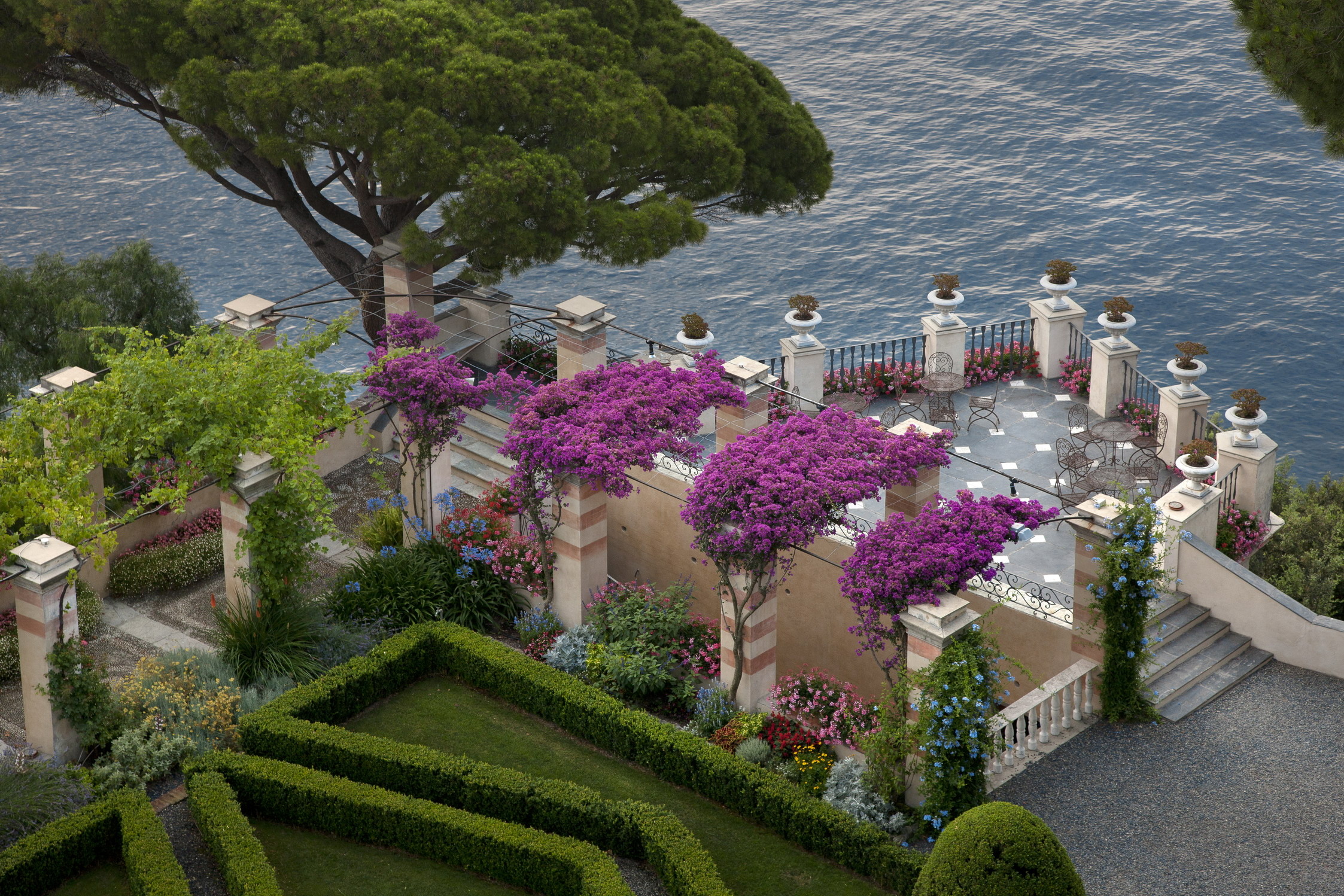 La terrazza lussureggiante si sporge verticalmente sopra il borgo, come a sorvolarlo in elicottero, e si offre come location unica per eventi di grande prestigio.