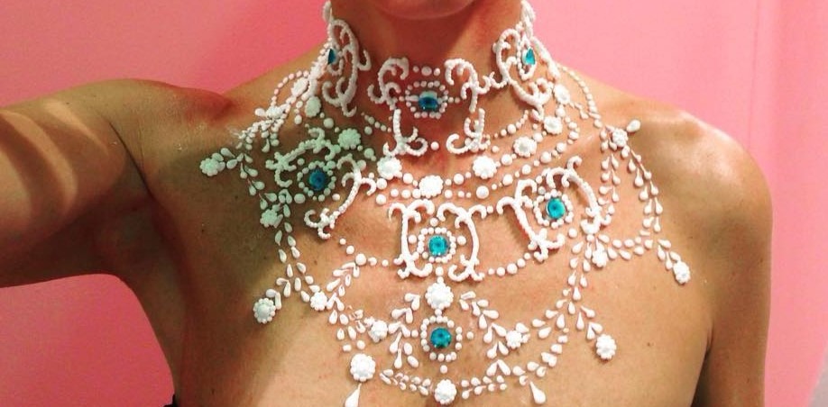 Una riflessione artistica che Davide, con l’aiuto di Marco, porta avanti anche nella sua produzione “extra cake” è il Body Caking®: un’arte performativa/pittorica che consiste nel decorare il corpo umano creando gioielli e tatuaggi con materiali commestibili come la ghiaccia reale e gemme di zucchero. Il Body Caking diventa quindi un’estensione innovativa della body art: gioca con materiali effimeri, rendendo l’opera stessa inevitabilmente temporanea…e a noi piace moltissimo!!!!!!!