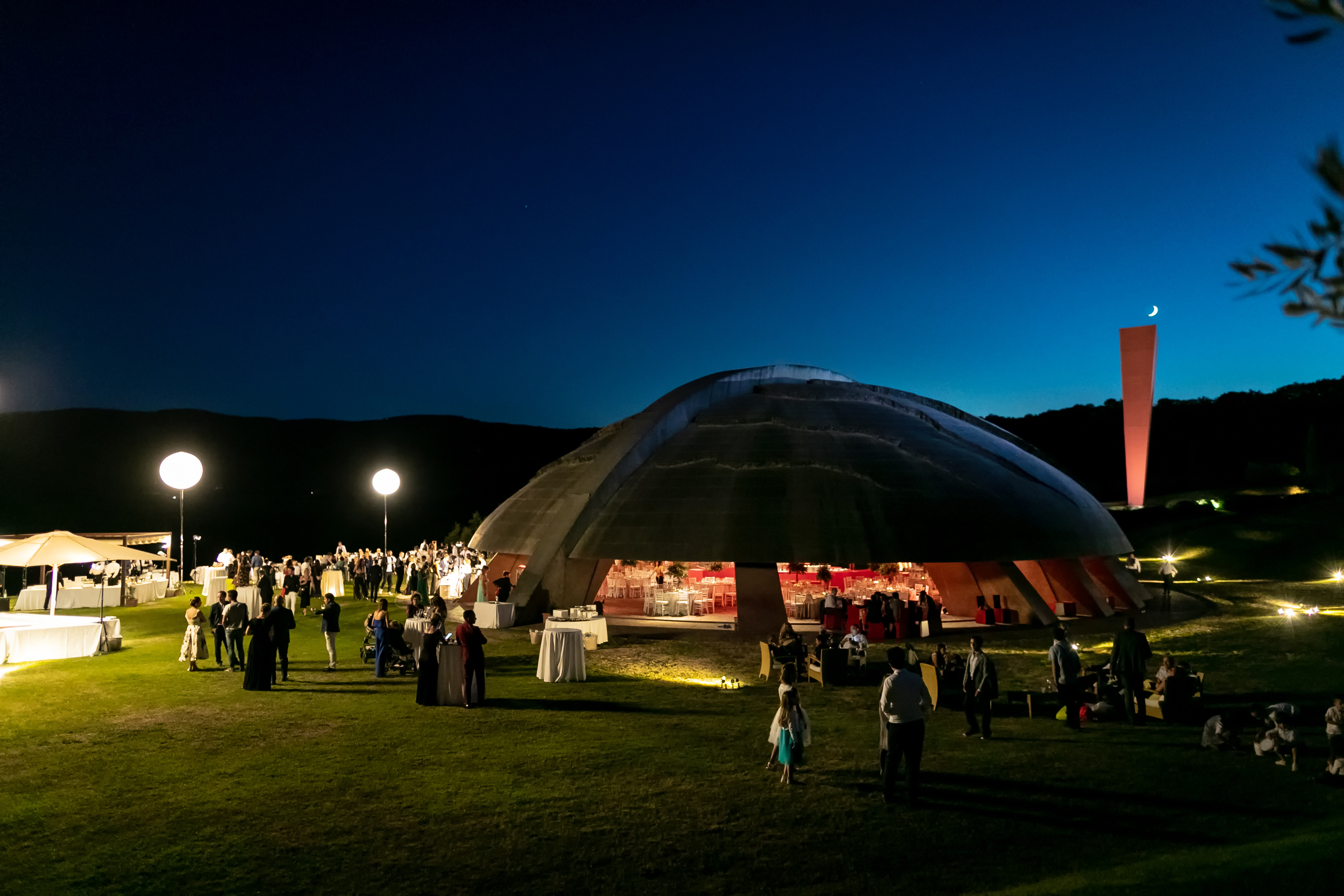 C’era bisogno, però, di una nuova cantina e la famiglia Lunelli, in virtù di una solida e vecchia amicizia con Arnaldo Pomodoro, uno dei maggiori artisti contemporanei, propose a lui di realizzarla. Il maestro accolse con entusiasmo la sfida di creare un’opera che mettesse in discussione i confini fra scultura e architettura, che dialogasse al tempo stesso con l’esterno, ossia con il paesaggio in cui si sarebbe inserita, e con l’interno, con quel vino alla cui produzione doveva essere strettamente funzionale.