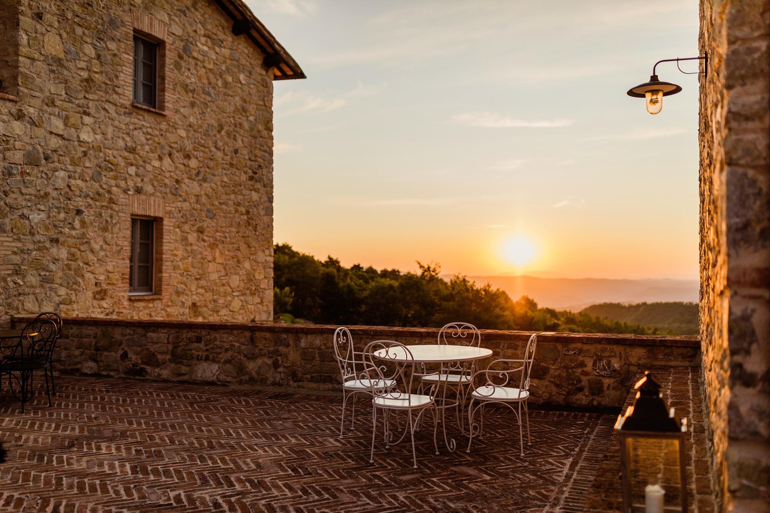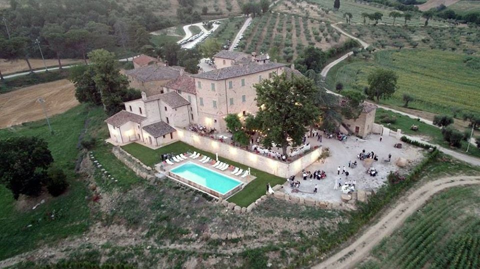 la posizione dominante rispetto la vallata e le sinuose colline che la circondano, che permette di godere di una vista a 360°, la piscina a sfioro sull’orizzonte, il luogo perfetto per apprezzare i meravigliosi tramonti, e la sala con antichi travi e suggestivi camini, che accoglie comodamente fino a 200 ospiti.